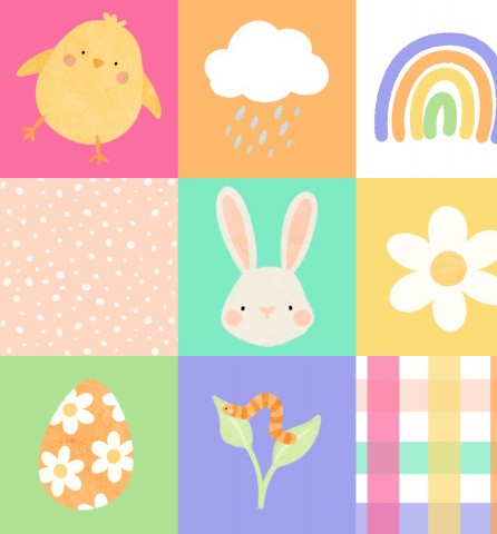 Musselin eine Sammlung von Osterbildern, darunter ein Häschen, Eier, Blumen und ein Regenbogen