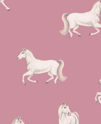 Dieses Design zeigt ein Muster aus weißen Pferden auf einem rosa Hintergrund.