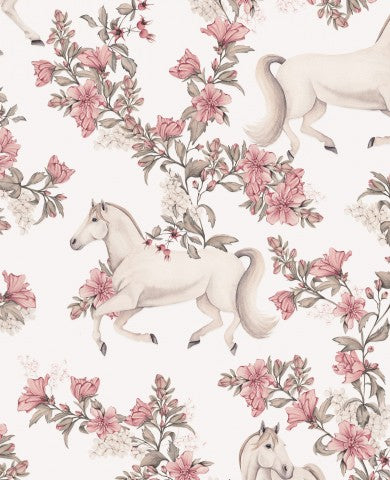 Das Muster strahlt eine heitere Eleganz aus und erzeugt eine ruhige Atmosphäre der Harmonie zwischen der Schönheit der Natur und der majestätischen Präsenz der Pferde.