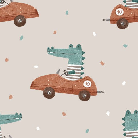 Dieses Design zeigt ein Krokodil, das auf beigem Hintergrund ein Auto fährt.