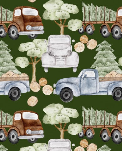 Dieses Design zeigt ein Muster mit Lastwagen und Bäumen auf grünem Hintergrund.