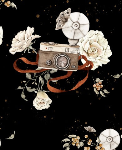 Dieses Design zeigt einen schwarzen Hintergrund mit Blumen und einer alten Kamera.