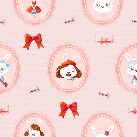 Dieses Design zeigt ein nahtloses Muster mit süßen Häschen auf rosa Hintergrund.