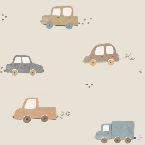 Dieses Design zeigt eine Sammlung von Autos und Lastwagen auf einem beigen Hintergrund.