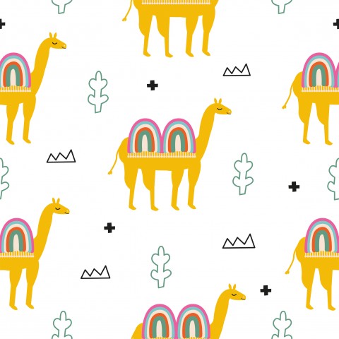 Dieses Design zeigt ein nahtloses Muster mit Kamelen und Kakteen.